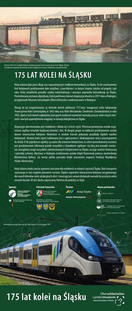 Dom Współpracy Polsko-Niemieckiej serdecznie zaprasza do wypożyczenia wystawy „175 lat kolei na Śląsku”, którą przygotowało Muzeum Ziemi Górnośląskiej w Ratingen. Ta polskojęzyczna ekspozycja przedstawia dzieje kolei na Śląsku. Zapraszamy miłośników kolejnictwa, jak również organizacje i instytucje kultury do wypożyczenia wystawy. Składa się ona z trzech części tematycznych, umieszczonych łącznie na 22 banerach.
