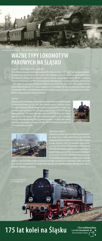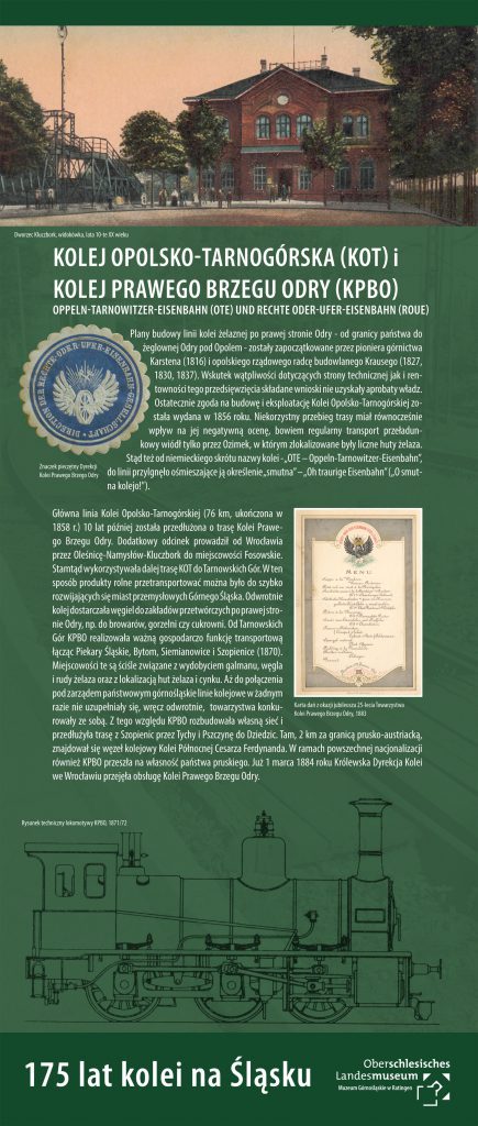 Wystawa ta, w znakomity sposób opisuje historię dróg żelaznych na Śląsku, zarówno ich początki jak i ewolucję. Przedstawione zostały przykłady węzłów kolejowych mających znaczenie zarówno lokalne, jak i międzynarodowe. Na planszach zostały umieszczone zagadnienia dotyczące zamian w budowie technicznej lokomotywy, wagonów kolejowych, a także ukazane zostało zaplecze techniczne, tak bardzo niezbędne do prawidłowego rozwoju sieci kolejowych. Na wystawie znajdą Państwo również najważniejsze szlaki kolejowe m.in.: Kolej Górnośląska, Kolej Wilhelma, Kolej Prawego Brzegu Odry czy Śląska Kolej Górska.
